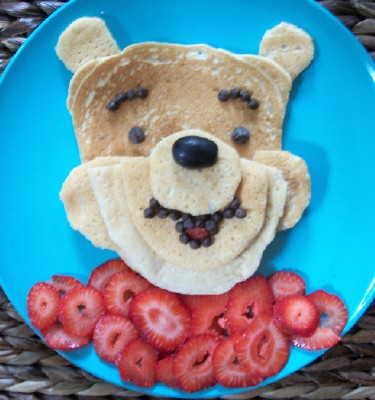 Food meet cartooish art in what looks like a delicious breakfast from Kitchen Fun With My 3 Sons made out of pancake batter, a grape, mini-chocolate chips or raisins garnished with strawberry slices.